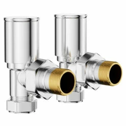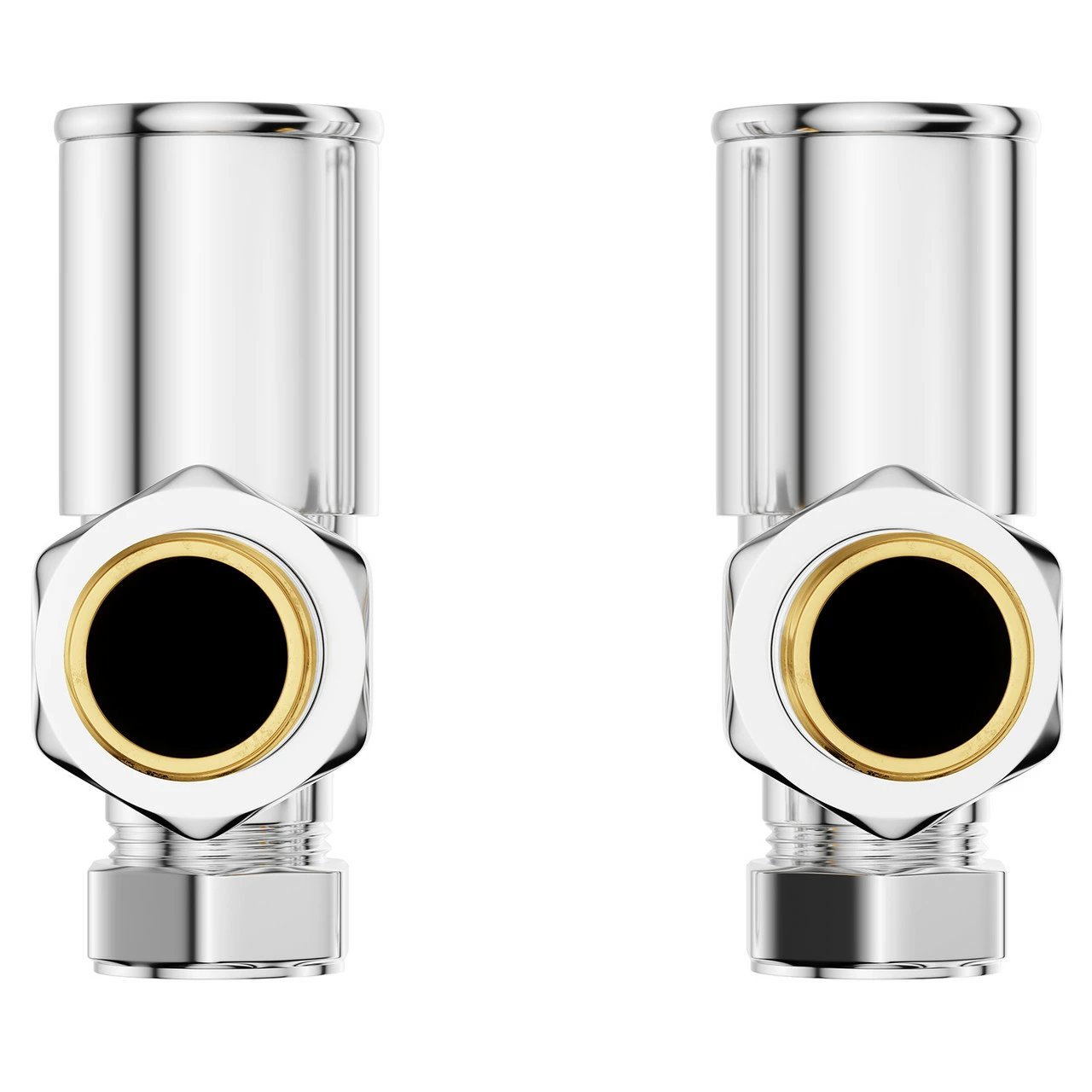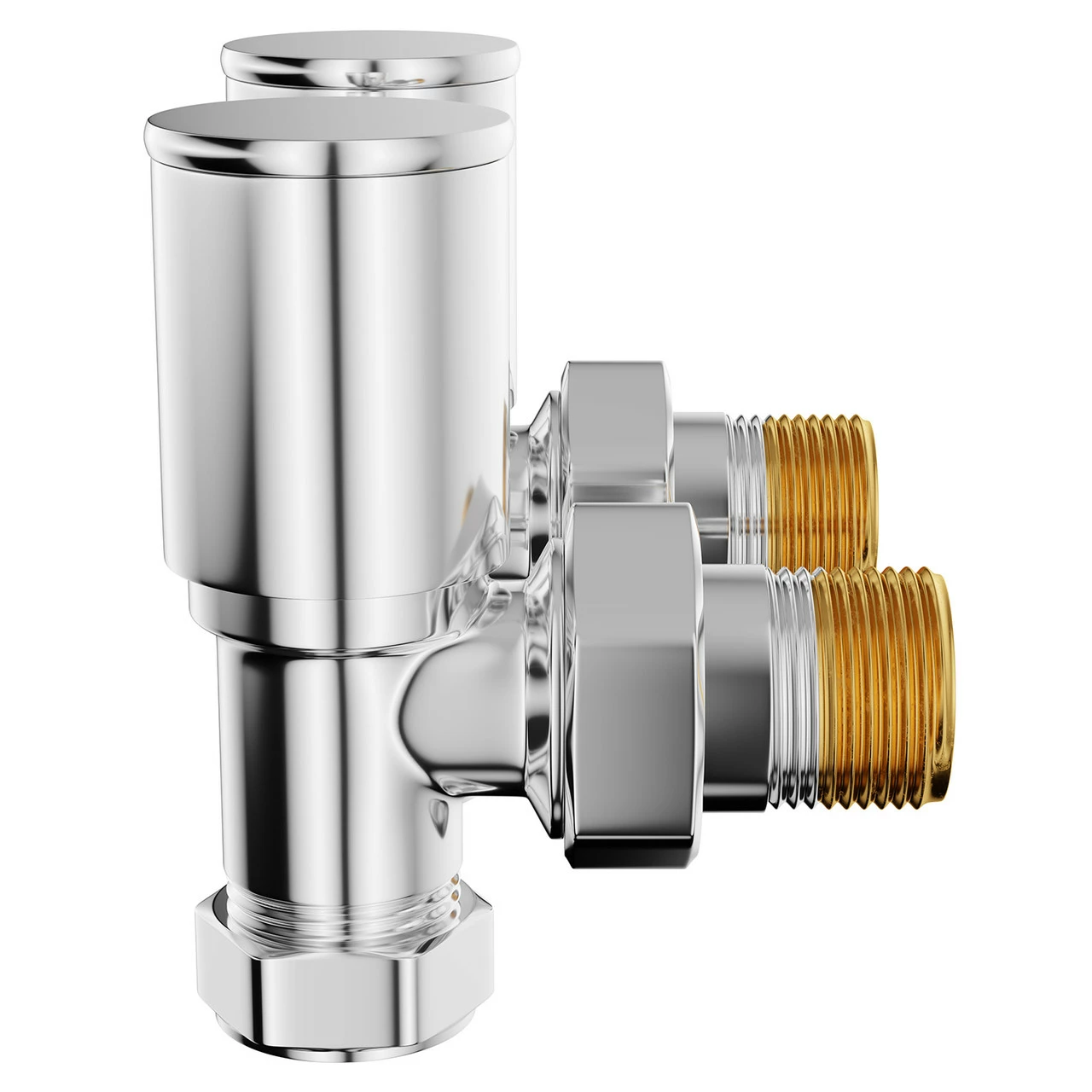 A pair of high quality angled round radiator valves with a deluxe chrome finish and twist action.