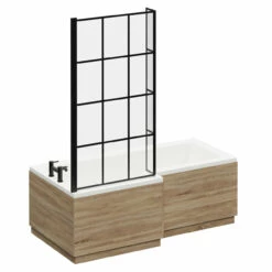 The Loire 1700mm Left Hand L Shaped Shower Bath with Matt Black Bath Screen and Bordalino Oak Front and End Bath Panel allows you to combine both a bath and shower within the same space. In a left-handed design, the L-shaped bathtub fits against the wall of your bathroom and provides ample space for both bathing and showering.